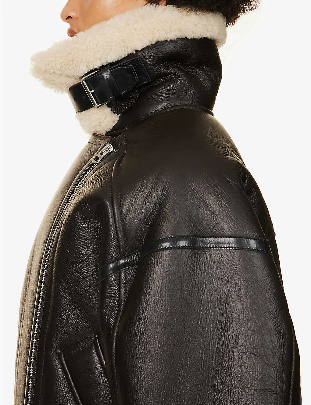 - Relaxed fit, exaggerated contrast collar, buckle-fastened throat strap, long sleeves, popper-fastened cuffs, two slip pockets at front, two buckle-fastened waist adjusters at front, panelled construction, shearling lining