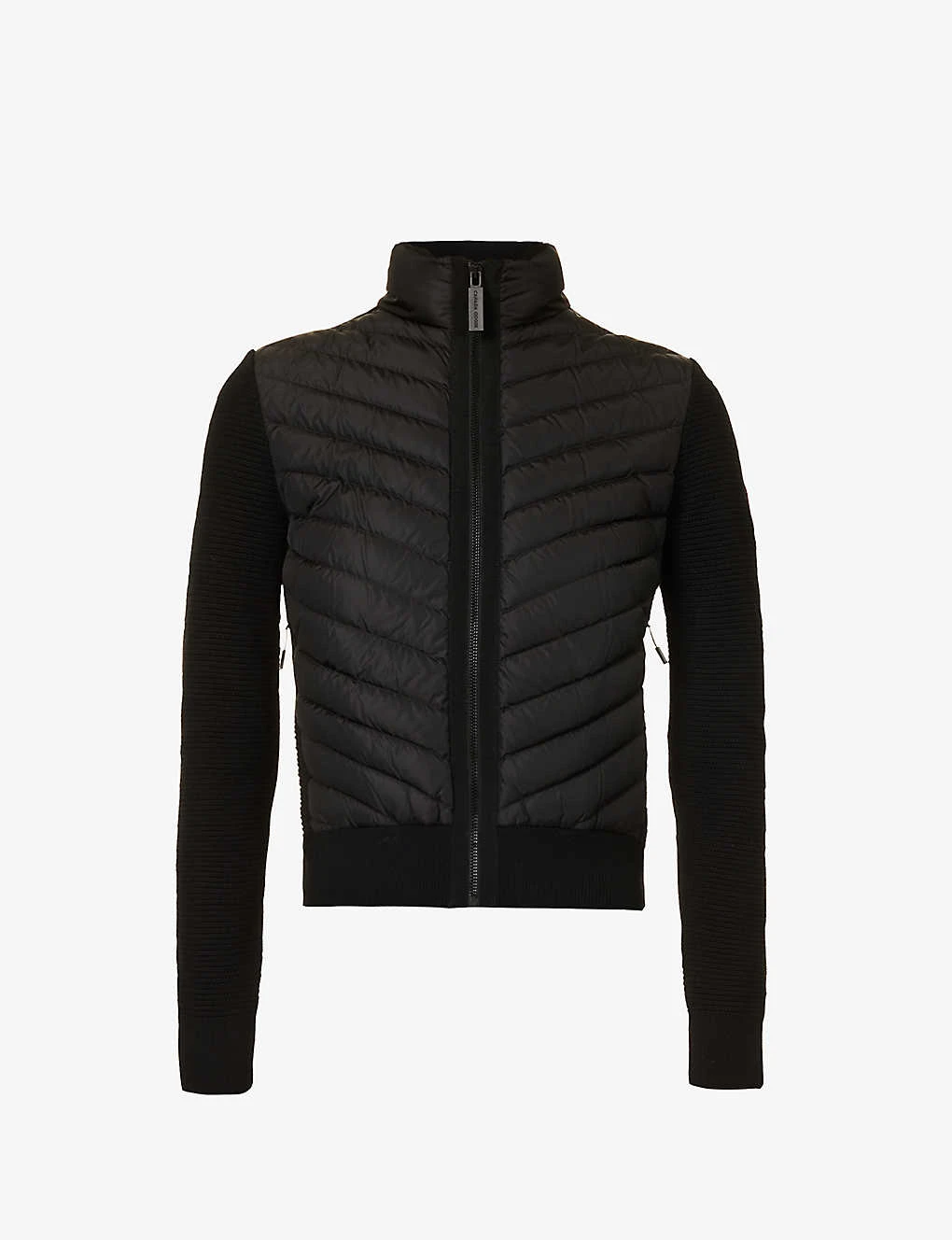 - Regular-fit, high neck, long sleeves, embroidered brand badge at sleeve, two zipped pockets at front, chevron quilted panel at front, all-over knitted panels, ribbed trims