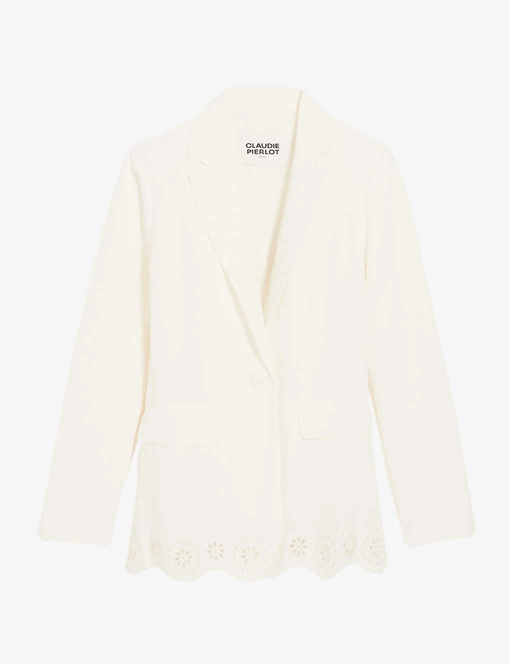 - Single breasted, notched lapels, long sleeves, buttoned cuffs, two flap pockets at front, double vent at back, fully lined, broderie anglaise at scalloped hem