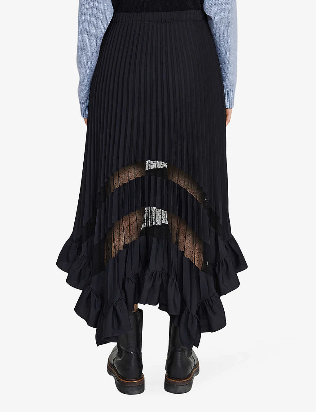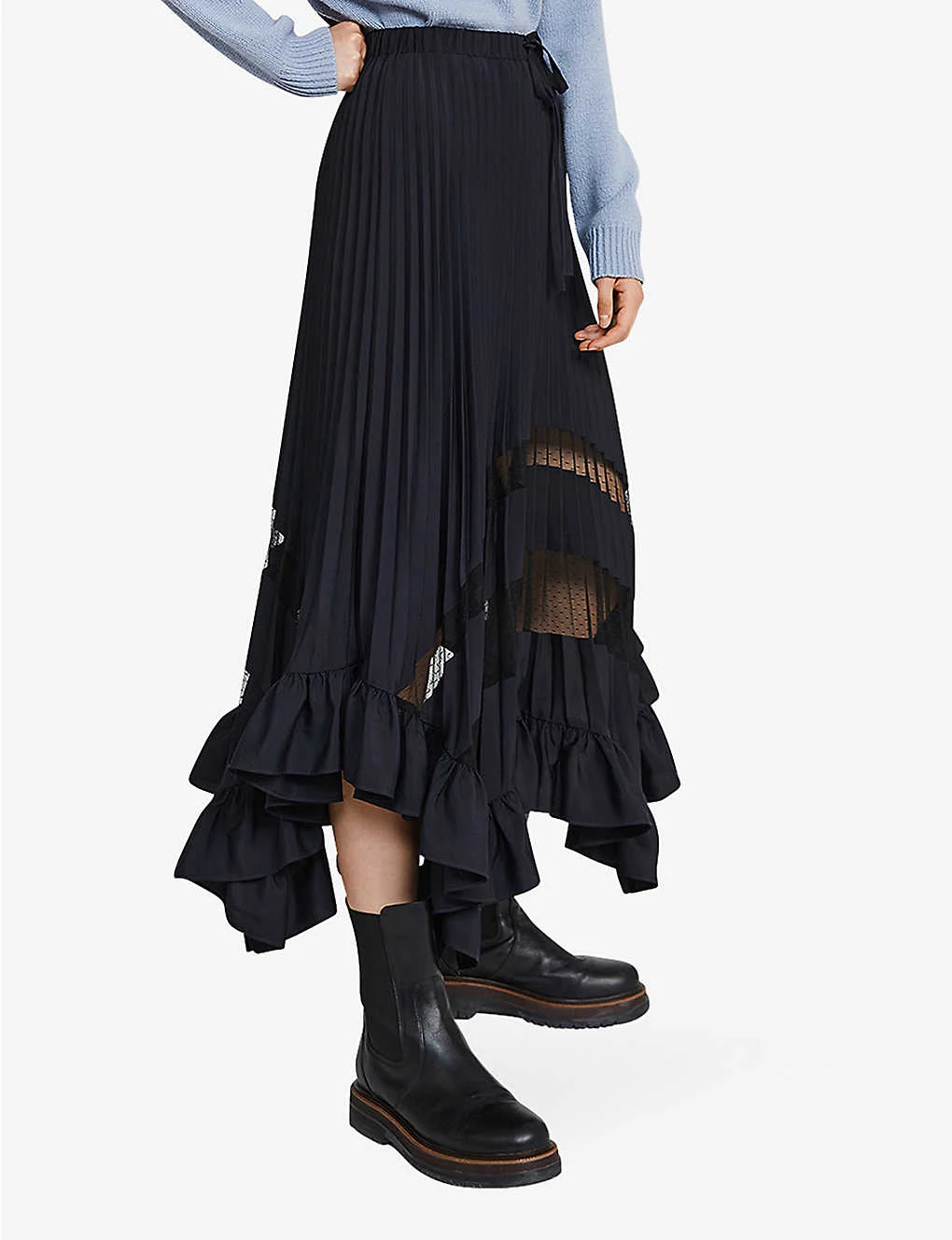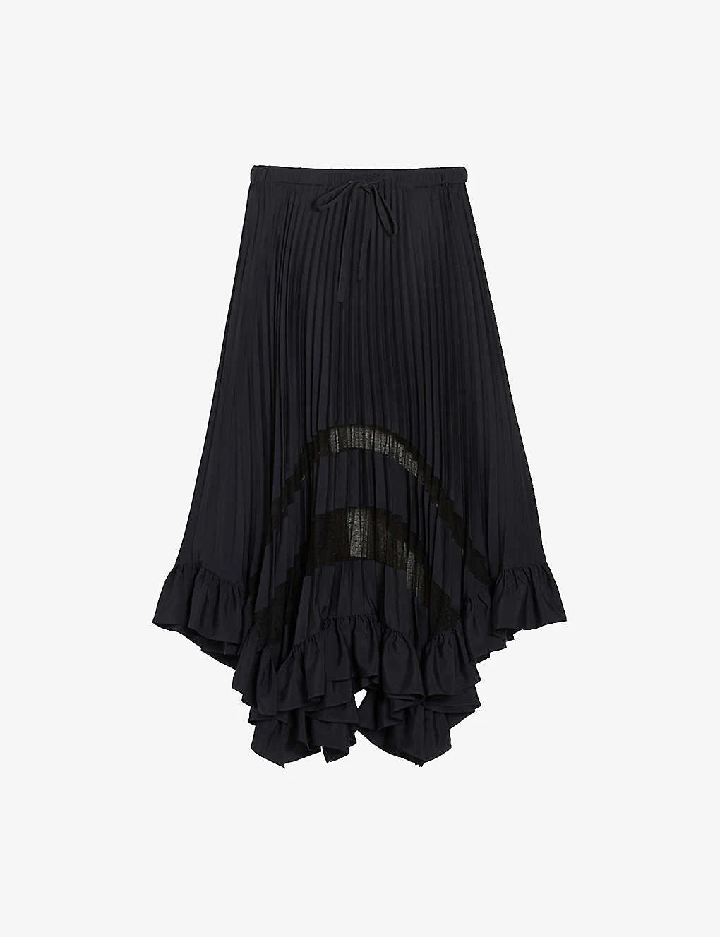 - High waist, elasticated drawstring waistband, all-over pleated, sheer panels, asymmetric hem with frilled trim, midi length
