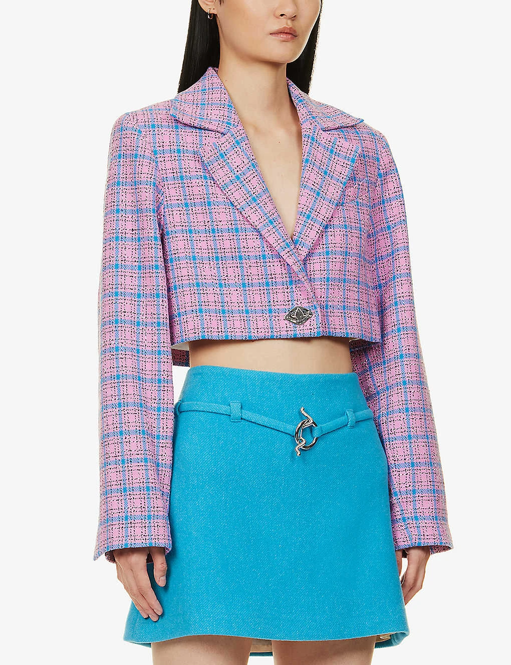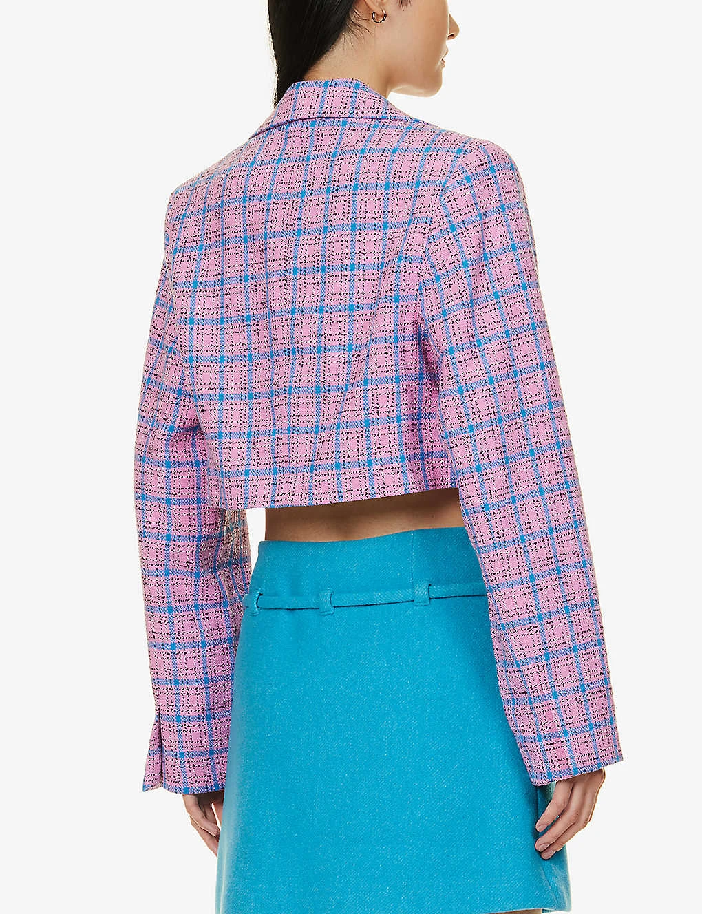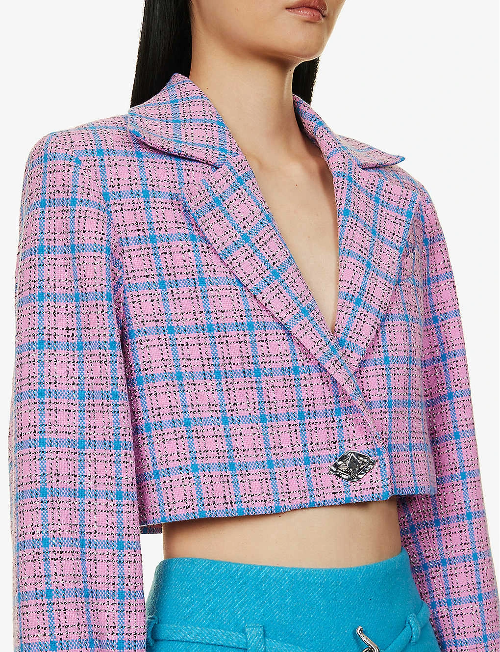 - Regular fit, notched lapels, padded shoulders, long sleeves, welt pocket at chest, all-over check pattern, branded silver-toned hardware, lined, cropped