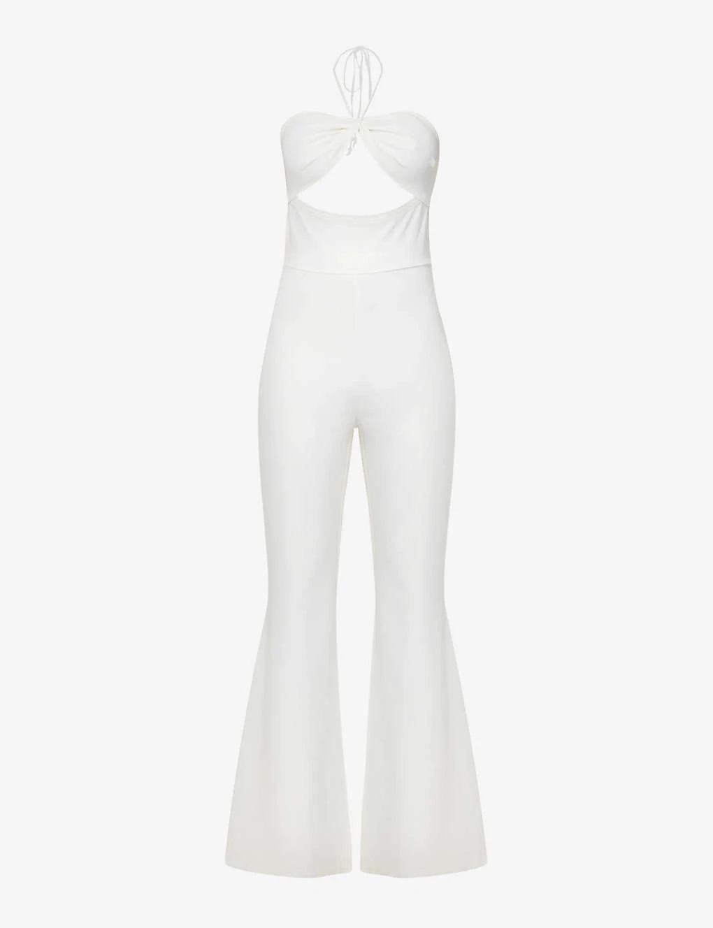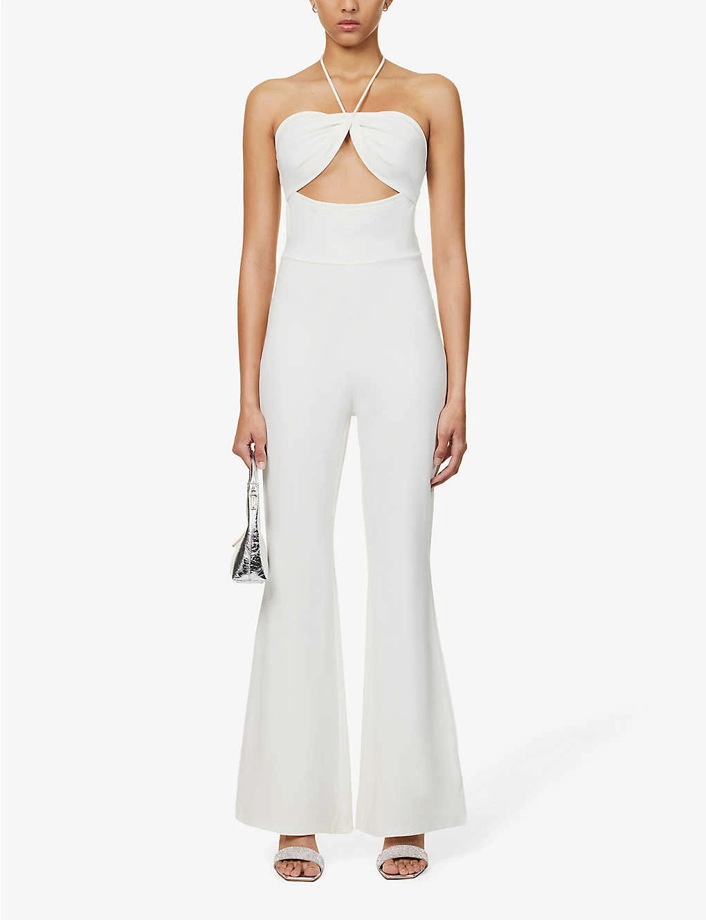 - Regular fit, halterneck, ruching at front, cut-out at front, darts at back, wide leg