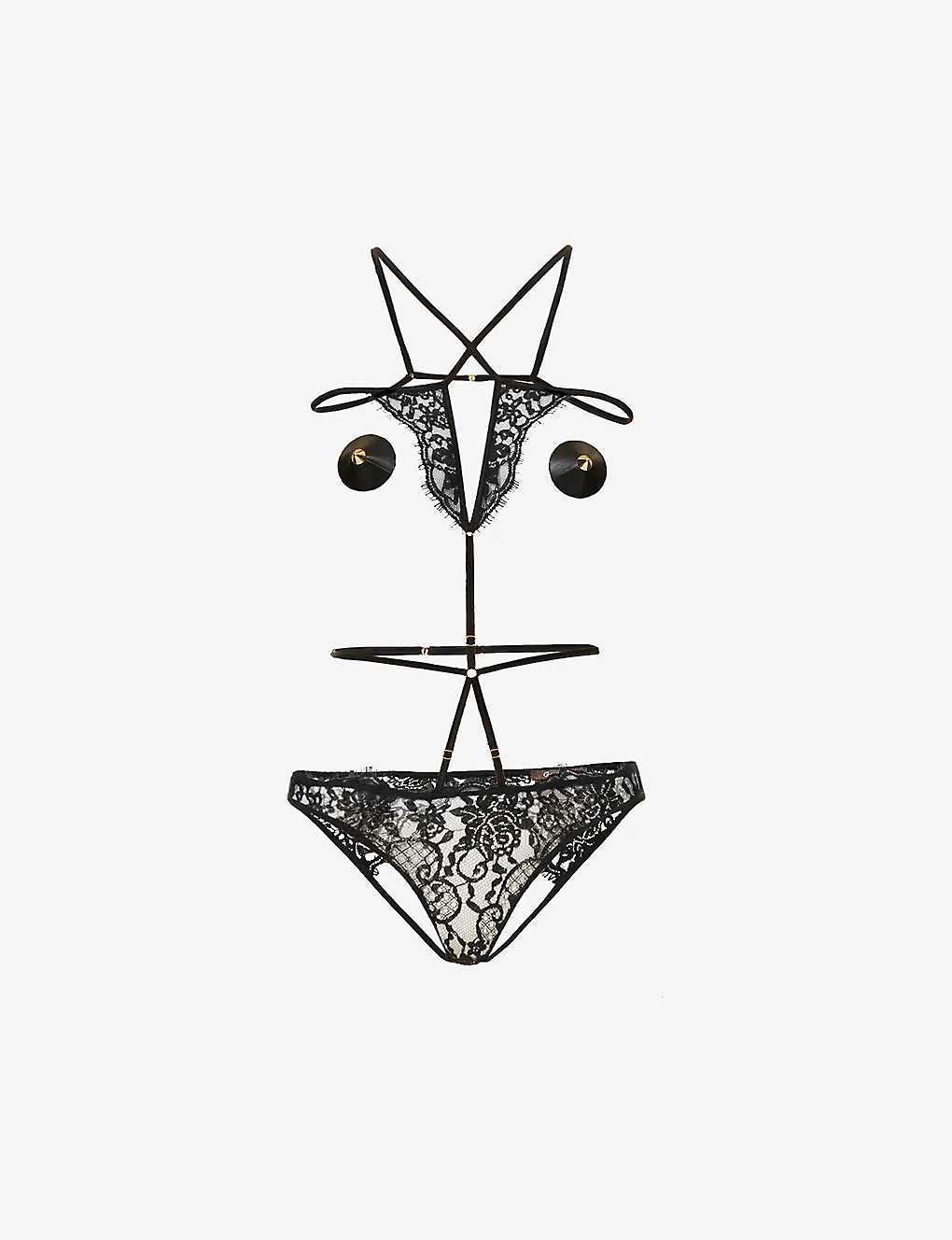 - Regular-fit, round neck, shoulder straps, gold-toned hardware, elasticated waistband, all-over semi-sheer floral lace panels, scalloped trims, open gusset