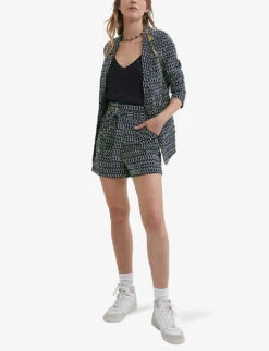 - Regular fit, mid-rise, structured elasticated waistband, abstract pattern, darts at front and back, brand metal plaque at back, flared split hem
