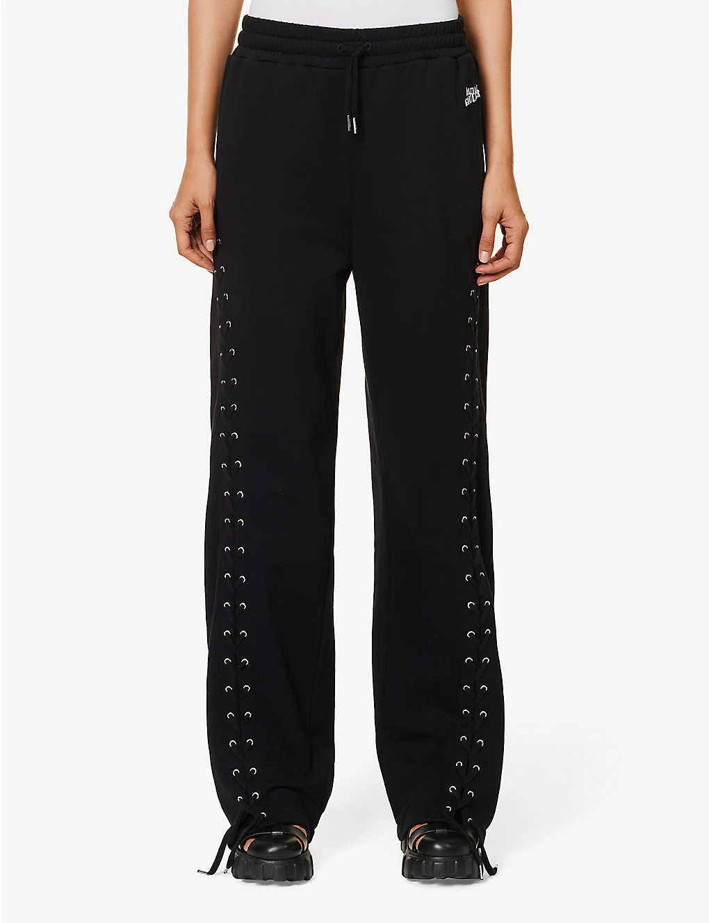 - Relaxed fit, mid-rise, wide leg, elasticated drawstring waistband, embroidered branding at front, two slip pockets at front, lace-up design at leg, locker loop at back