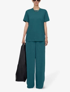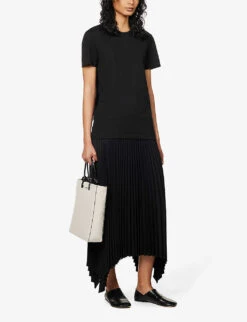 - Regular fit, mid-rise, structured elasticated-rib waistband, all-over pleat pattern, asymmetric hem