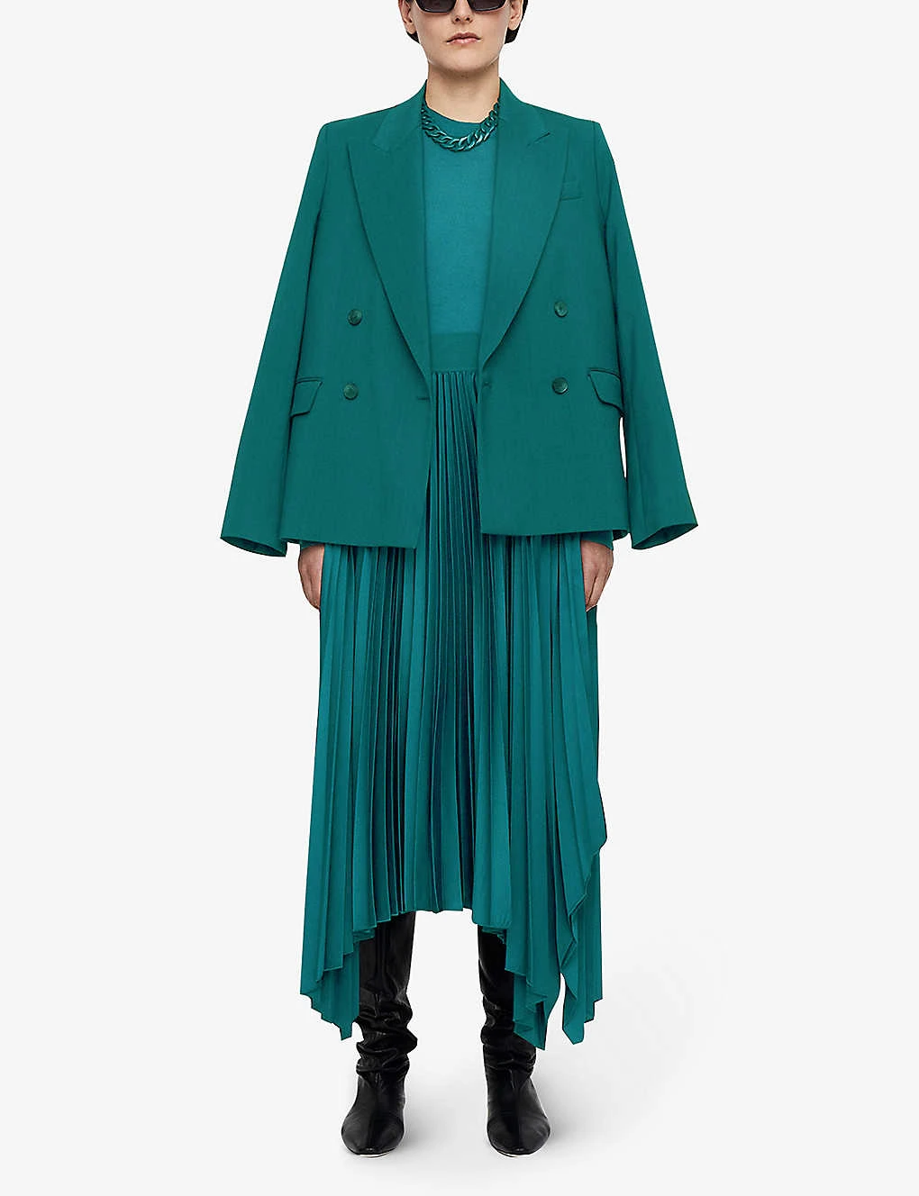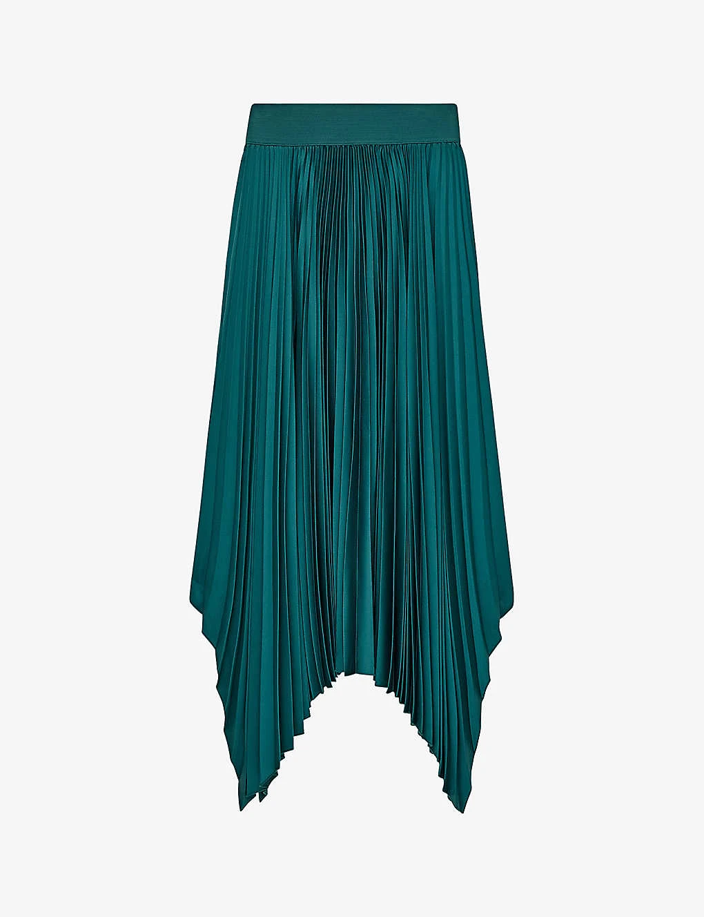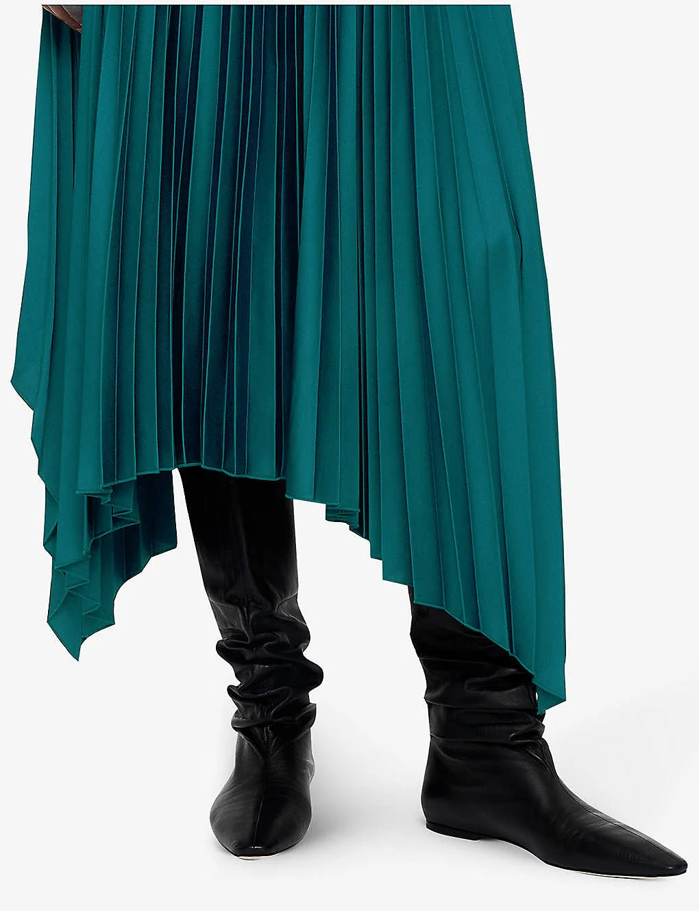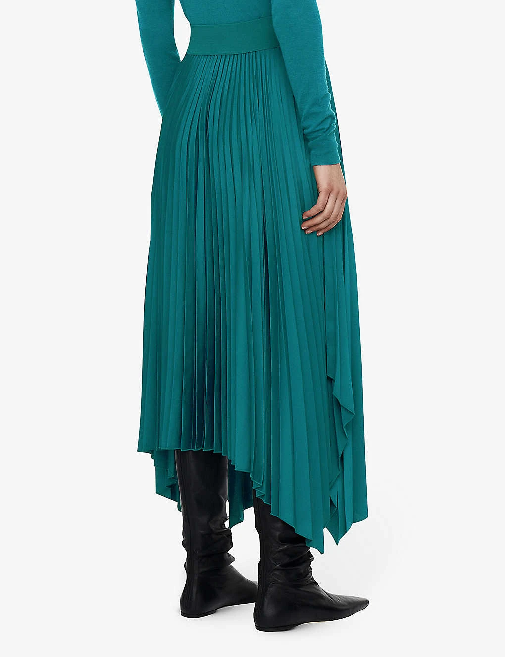 - Regular fit, high rise, elasticated waistband, midi length, asymmetric hem, pleated