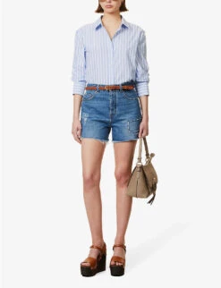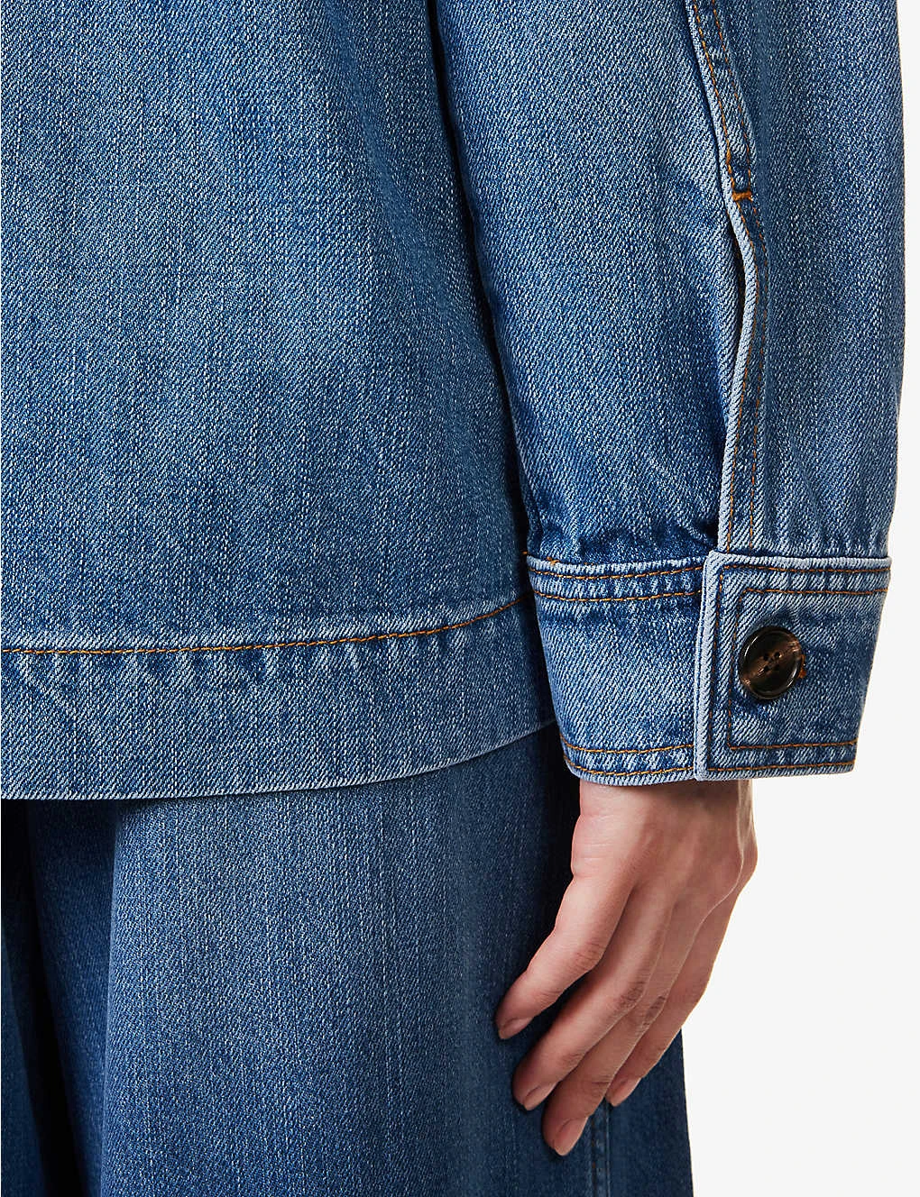 - Relaxed-fit, round neck, collar, long sleeves, four buttoned flap pockets at front, all-over faded wash, contrast stitching,