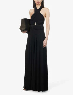 - Regular fit, V-neckline, halter strap, flared leg, sleeveless, two slip pockets at front, two patch pockets at back, belt loops with detachable belt, mid-wash, contrast stitching, silver-toned hardware