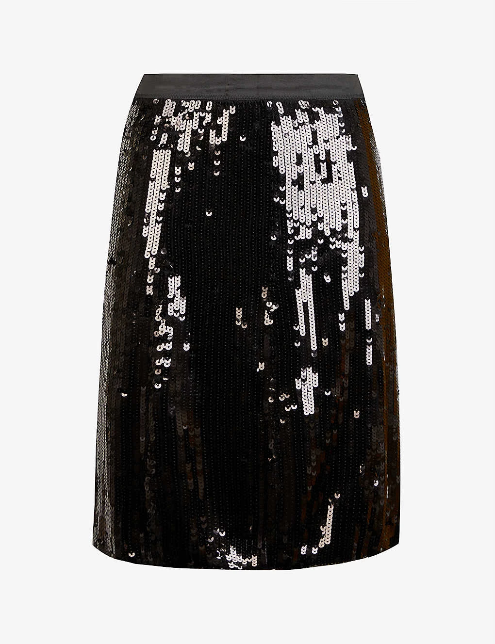 - High waist, elasticated waistband, all-over sequinned pattern, relaxed silhouette, curved hem