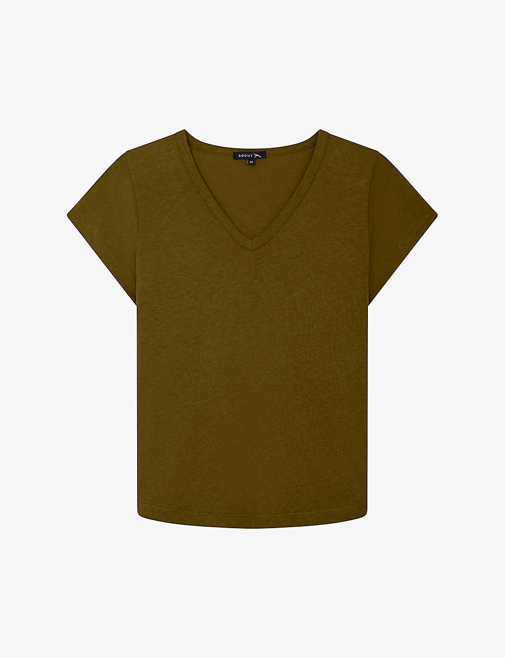 - V-neck, dropped shoulders, short sleeves, relaxed fit, straight hem