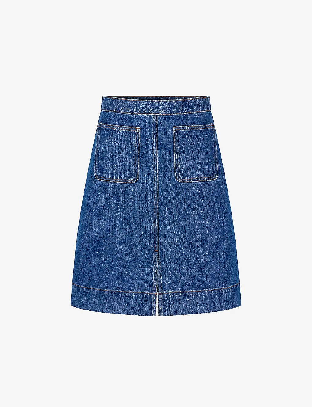 - A-line silhouette, above-knee length, two front patch pockets, two back patch pockets, centre slit at front, contrasting stitching