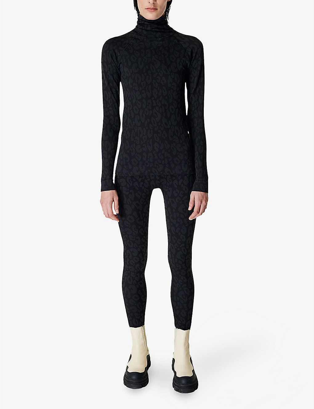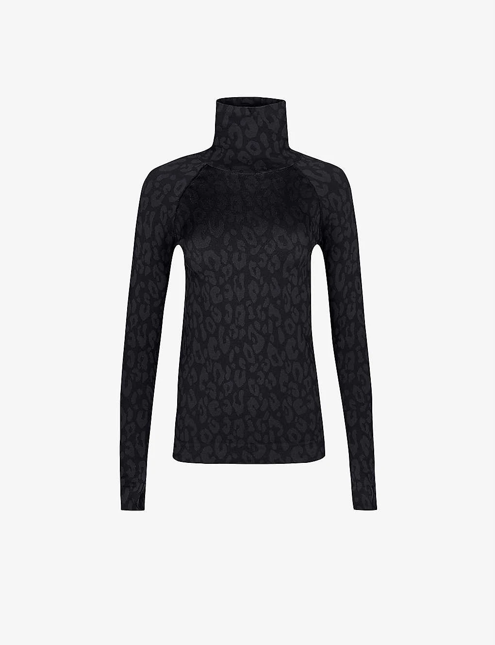 - High neck, long raglan sleeves, all-over leopard jacquard pattern, sweat wicking, fitted, seamless, brand logo at back