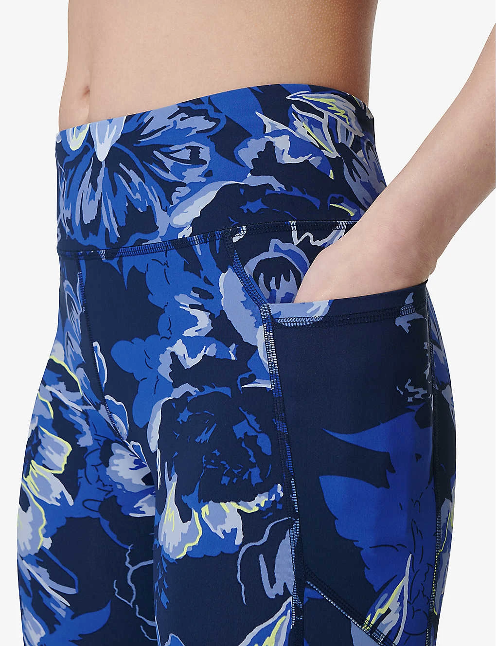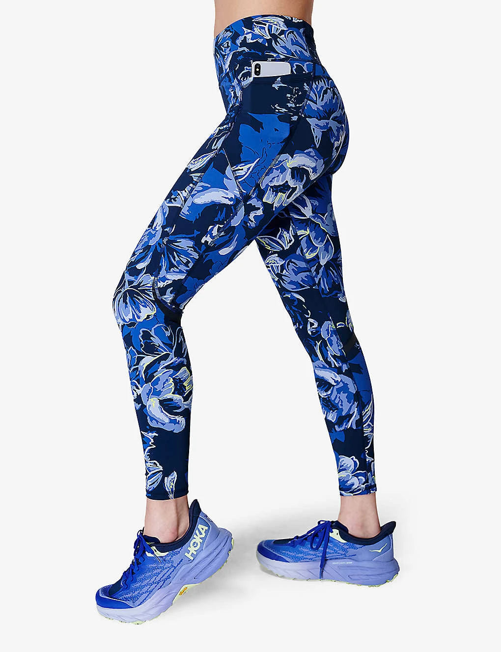- Fitted, high rise, full-length leg, elasticated drawstring waistband, one slip pocket at side, one zipped pocket at back, moisture wicking, compression panels, 40+ UV protection, all-over print, signature brand print at back hem