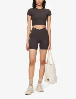 - Fitted, round neck, ribbed trim at neck, short sleeves, exposed seams
