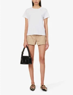 - Regular-fit, high-waist, elasticated drawstring waistband, A-line silhouette, two slip pockets at front, all-over satin texture, soft pleats