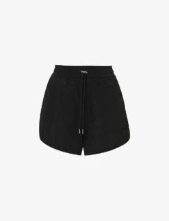 - Regular fit, high rise, elasticated drawstring waistband, two slip pockets at sides, welt pocket at back, silver-toned branded hardware, partially lined