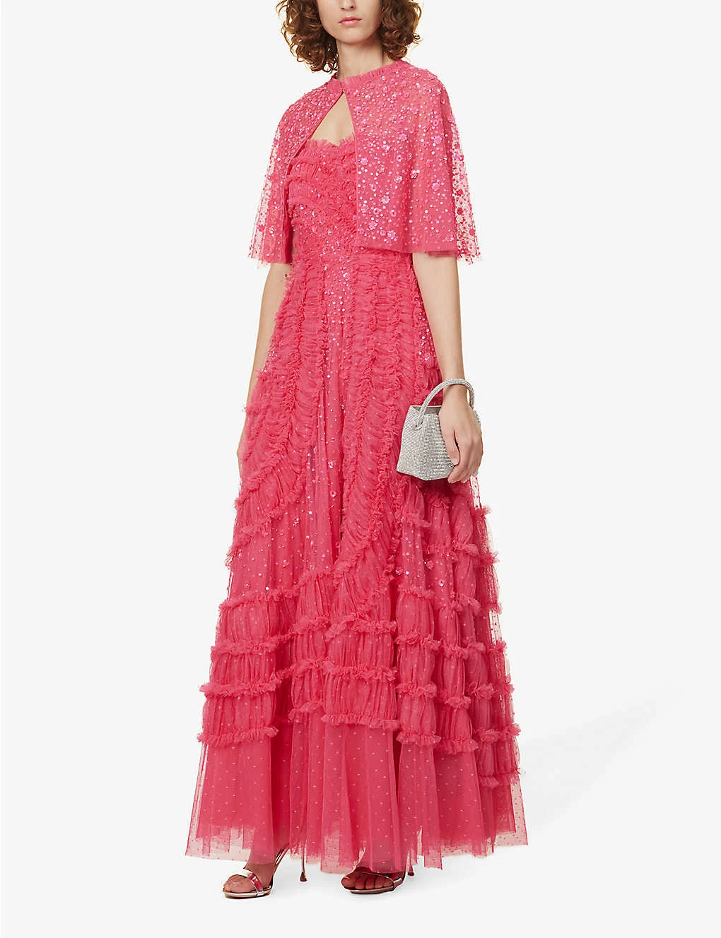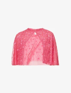- Regular-fit, round neck, cape sleeves, all-over sequin-embellishment, raw hem